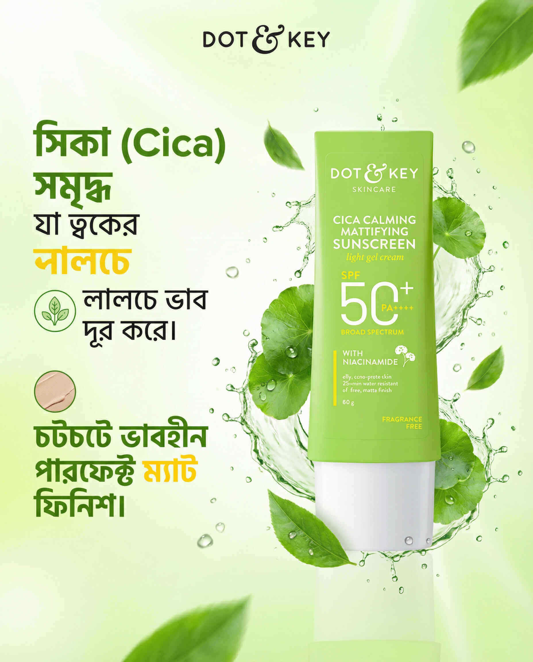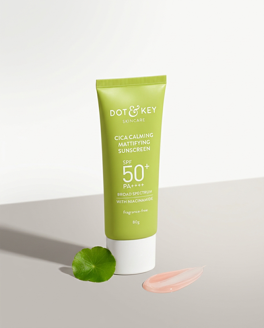 Dot & Key Cica Calming Mattifying Sunscreen একটি ব্রড-স্পেকট্রাম সানস্ক্রিন যা ত্বককে সূর্যের ক্ষতিকর UVA ও UVB রশ্মি থেকে রক্ষা করে। সিকা এবং নিয়াসিনামাইড সমৃদ্ধ এই লাইটওয়েট জেল ক্রিমটি ত্বককে শান্ত, আর্দ্র ও তেলমুক্ত ম্যাট ফিনিশ দেয়, যা তৈলাক্ত ও ব্রণপ্রবণ ত্বকের জন্য আদর্শ।