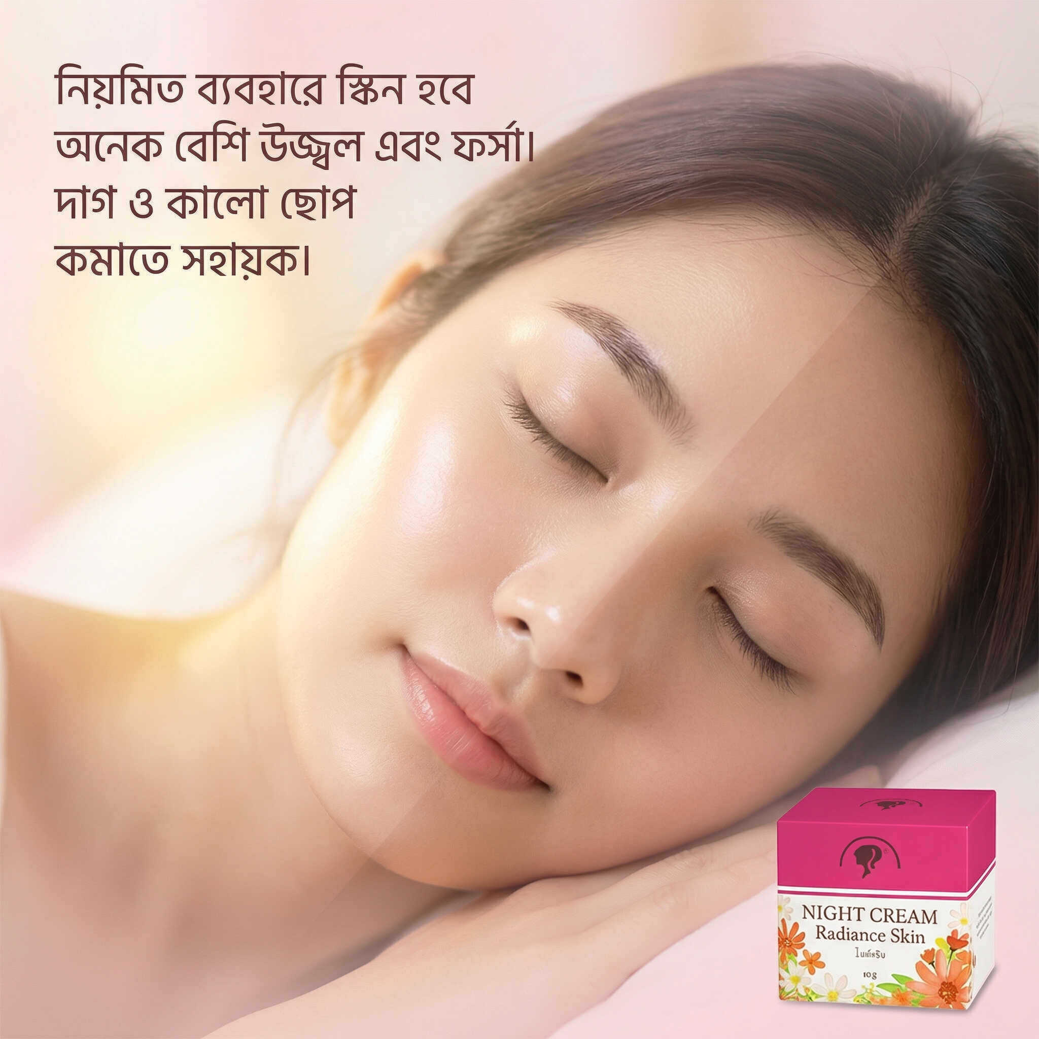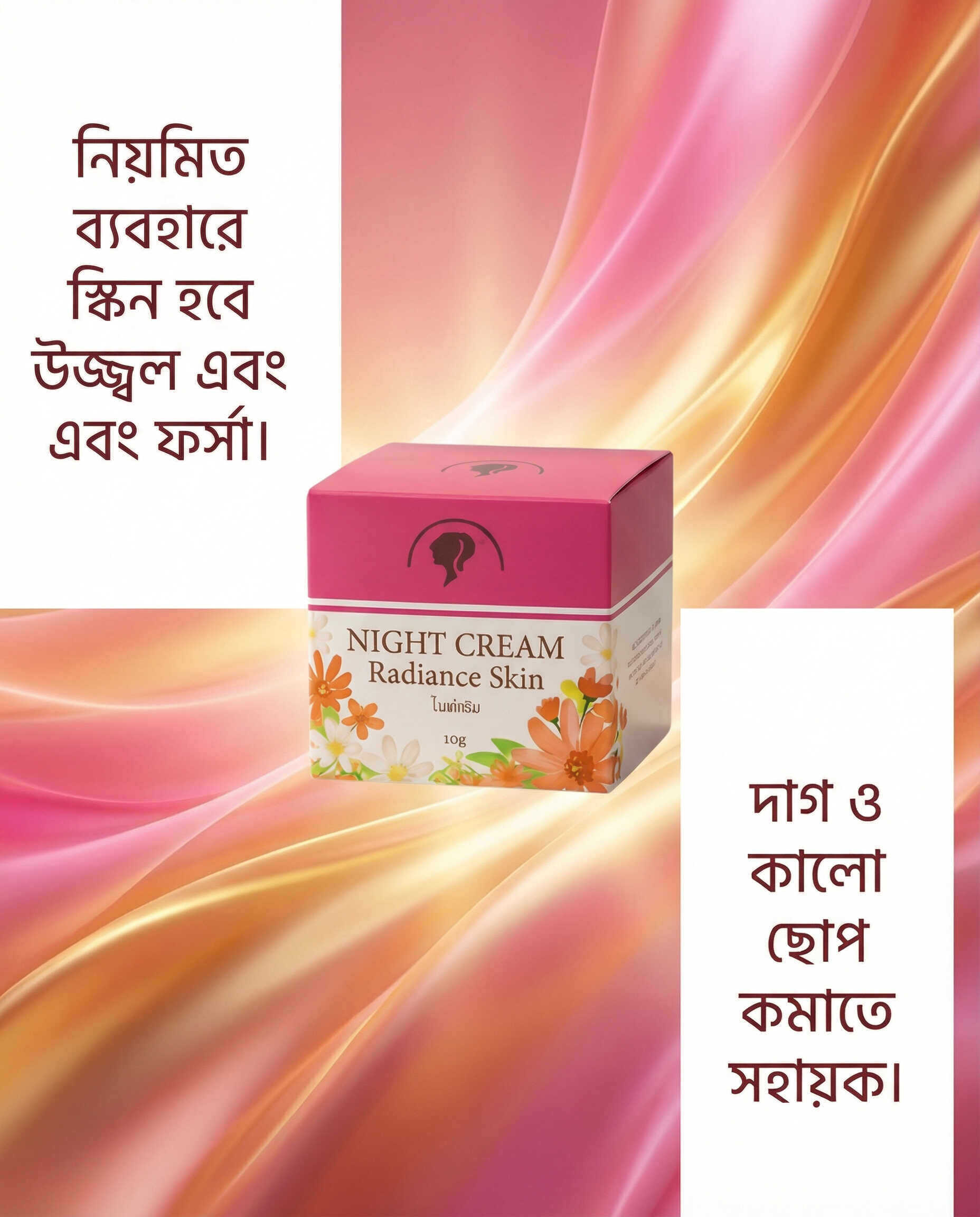 প্রিমিয়াম নাইট ক্রিম যা রাতারাতি ত্বক উজ্জ্বল করে, গভীর আর্দ্রতা প্রদান করে এবং কালো দাগ কমায়। হালকা, অ-চিটচিটে এবং সকল ধরণের ত্বকের জন্য উপযুক্ত।